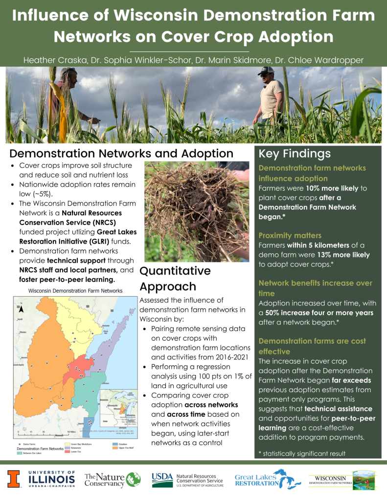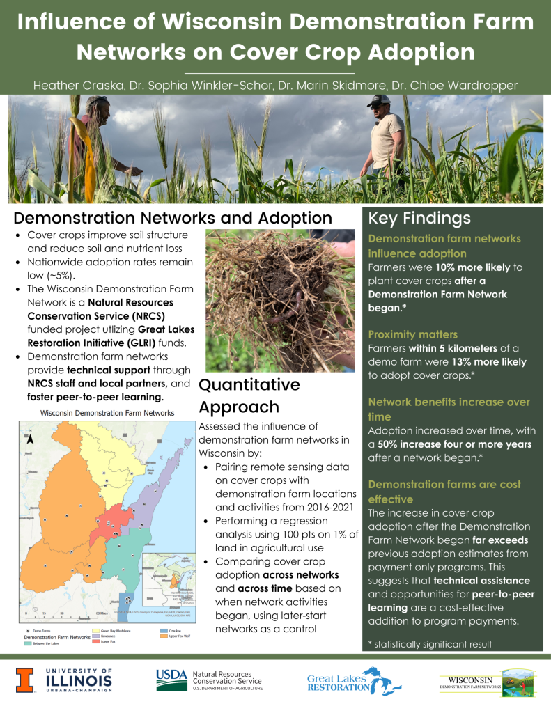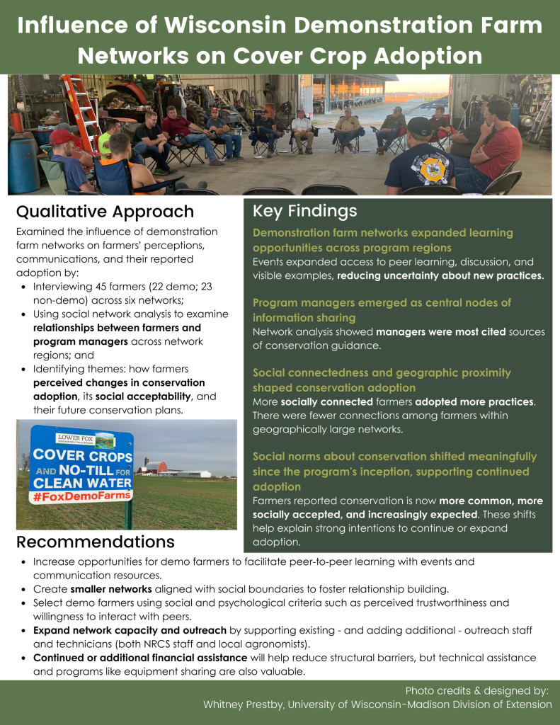 In partnership with the Wisconsin Demonstration Farm Networks, researchers from the University of Illinois-Urbana Champaign conducted a multi-year study to understand how demo farms have impacted conservation adoption in their respective watersheds. This two-part study was designed to quantify how much the demo farms have influenced cover crop adoption and to understand how the demo farms have catalyzed land use changes.