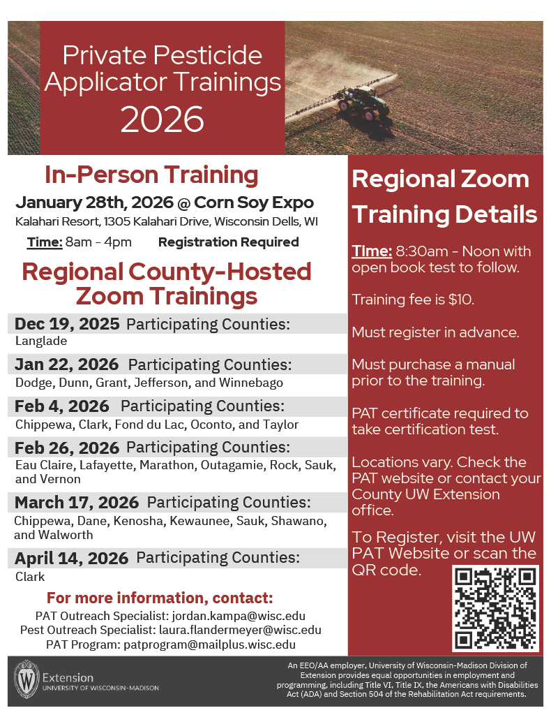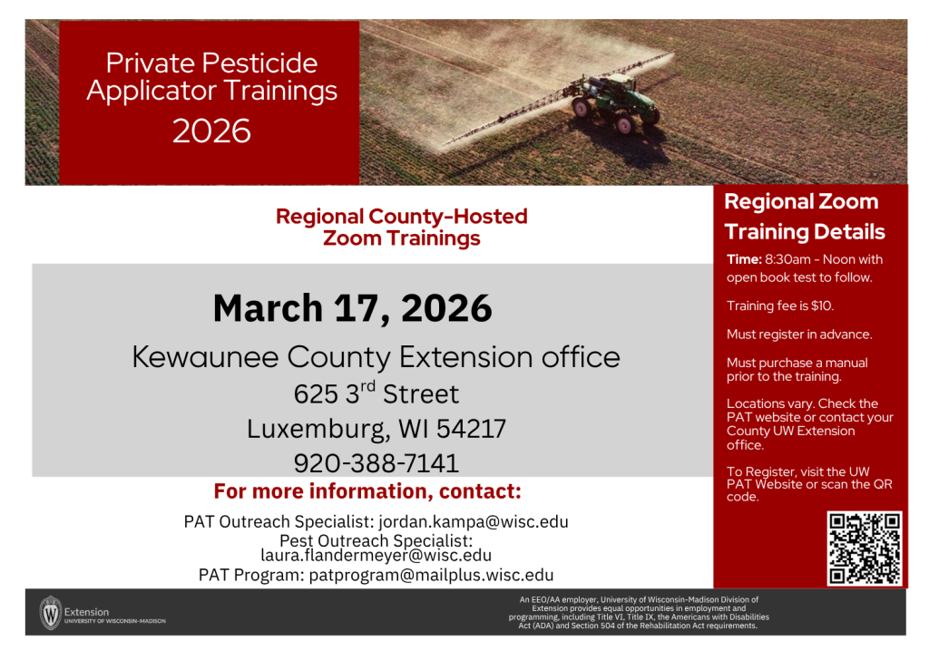 Remember … After completing the on-line training or self-study, you must TEST IN-PERSON at the Kewaunee County Extension office. You must call ahead to schedule a time to take the test! 920-388-7141. With a passing grade, you will receive a 5-year certification.