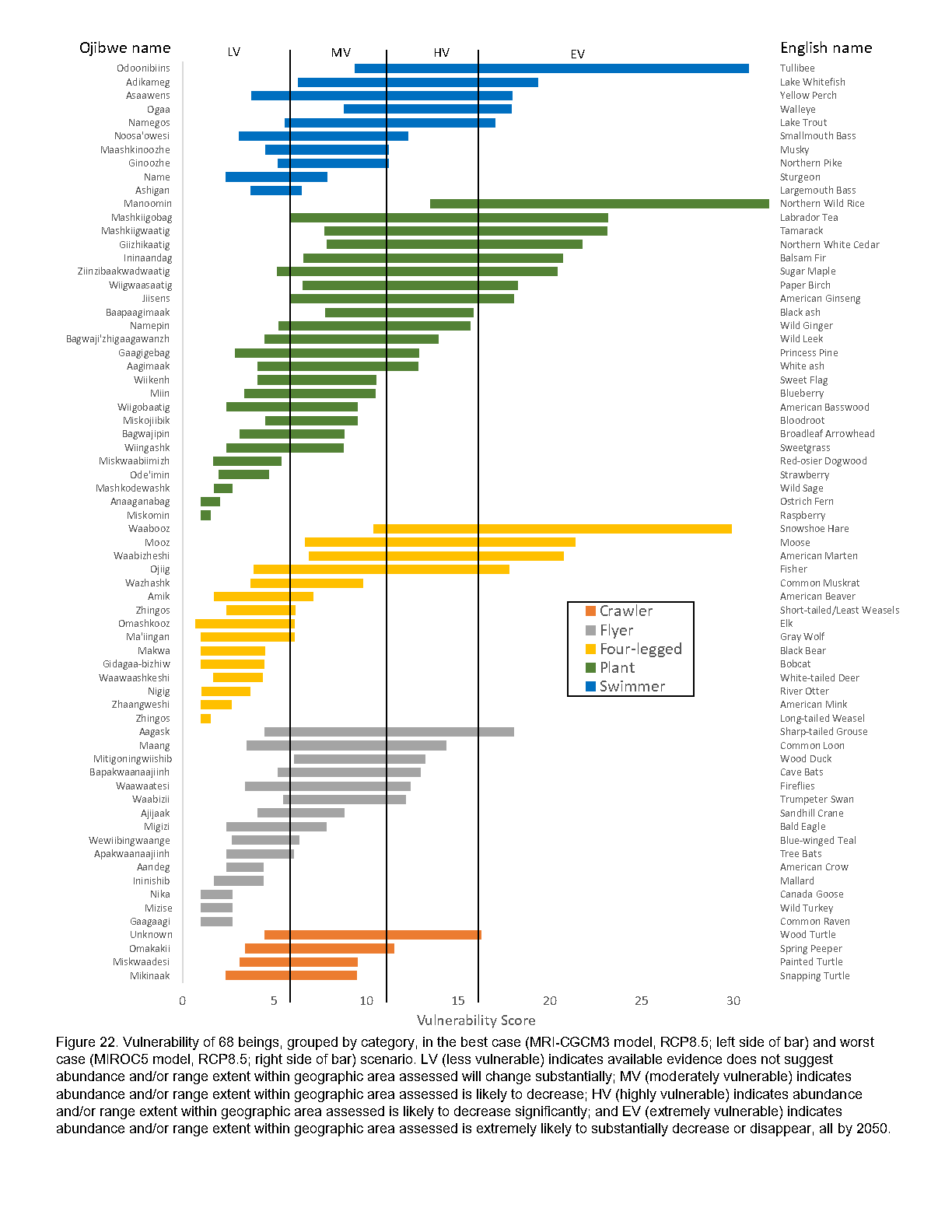 download that describes the vulnerability of 66 plant and animal beings (species) to climate change based on traditional ecological knowledge (TEK) of the Lake Superior Ojibwe people and “academic” science. The Climate Vulnerability Ratings Chart rank vulnerability of these beings in the upper Midwest Ceded Territories by the mid-21st century. This assessment was developed by the Great Lakes Indian Fish and Wildlife Commission (GLIFWC).