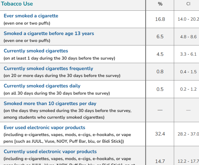 The CDC’s Youth Risk Behavior Surveillance System (YRBSS) monitors the prevalence of health-risk behaviors and experiences among U.S. high school students. Conducted biennially since 1991, the YRBSS surveys a broad range of issues that contribute to the leading causes of death, disability, and social problems among youth, including tobacco use, diet, physical activity, substance use, sexual behaviors, and violence/injury. The data can be used to evaluate national trends. Data may be available at a state, location, or school district level, but this is only the case for selected locations.