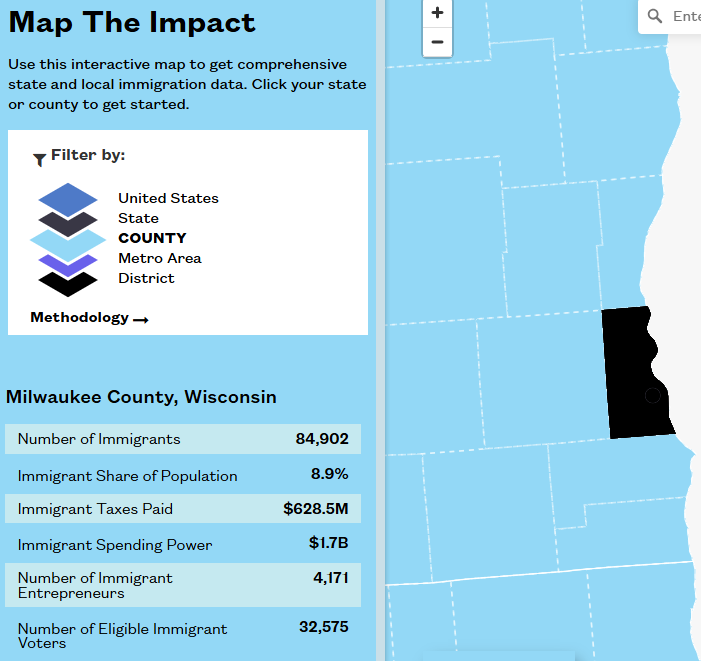 This census data visualization tool from the American Immigration Council centers on the economic impact of immigrants as found in American Community Survey data. Topics include immigrant population share, taxes paid, spending power, number of entrepreneurs, and eligible voters. Data at the the state level comes from the 2023 ACS, but data at the county or congressional district level comes from earlier versions of the ACS. Data is limited at the county level but more available at the metro area or congressional district levels.