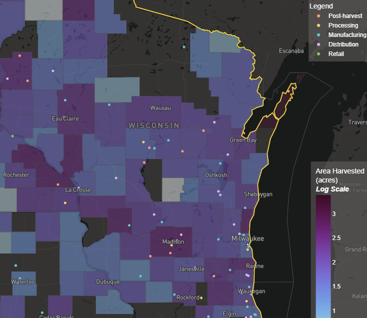 This resource shows production by county of specialty crops in categories such as fruits, tree nuts, novel oilseeds, and small grains, and the infrastructure needed to move crops from fields to consumers. The goal of this tool is to help farmers find processors, help investors find gaps where new facilities are needed, and help buyers identify regional sourcing options. Production data comes from USDA NASS; asset data comes from a private logistics and business data provider.