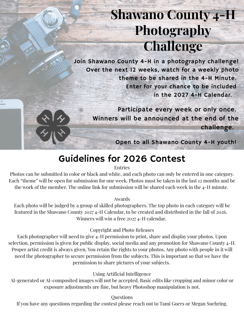 Join Shawano County 4-H in a photography challenge! Over the next weeks, watch for a weekly photo theme to be shared in the 4-H Minute and on Shawano County 4-H’s Facebook Page.