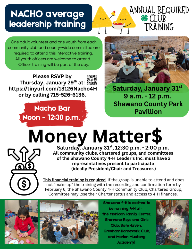 Annual Shawano County 4-H Club, Committee, & Group Training Event Information Date January 31st, 2026Time 9:00am - 3:00pm Event LocationShawano County Park Pavilion, W5791 Lake Dr, Shawano, WI 54166