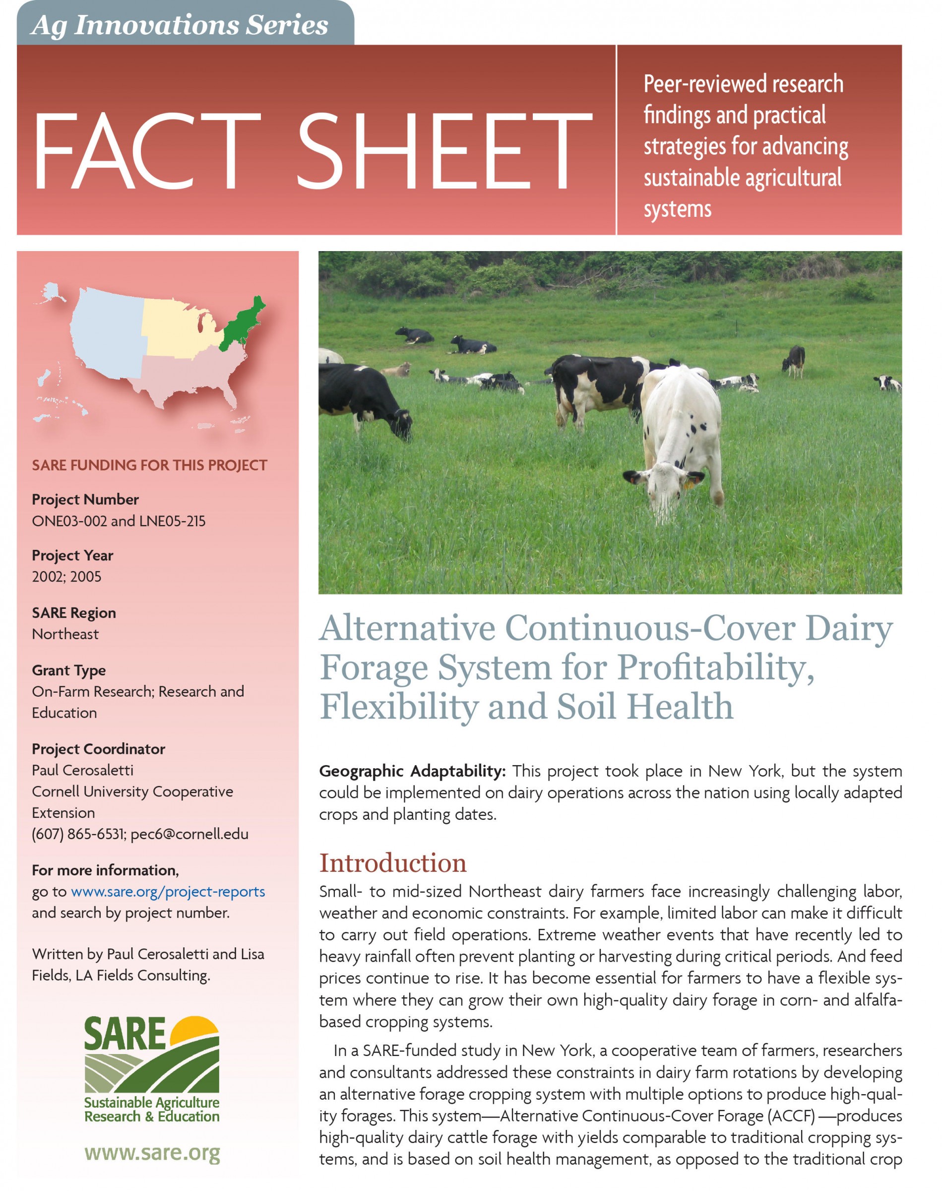 A new SARE fact sheet, Alternative Continuous-Cover Dairy Forage System for Profitability, Flexibility and Soil Health, describes such a system. One farmer increased net income $531 per acre after implementing the alternative continuous-cover forage (ACCF) system in collaboration with Cornell University Cooperative Extension researchers.