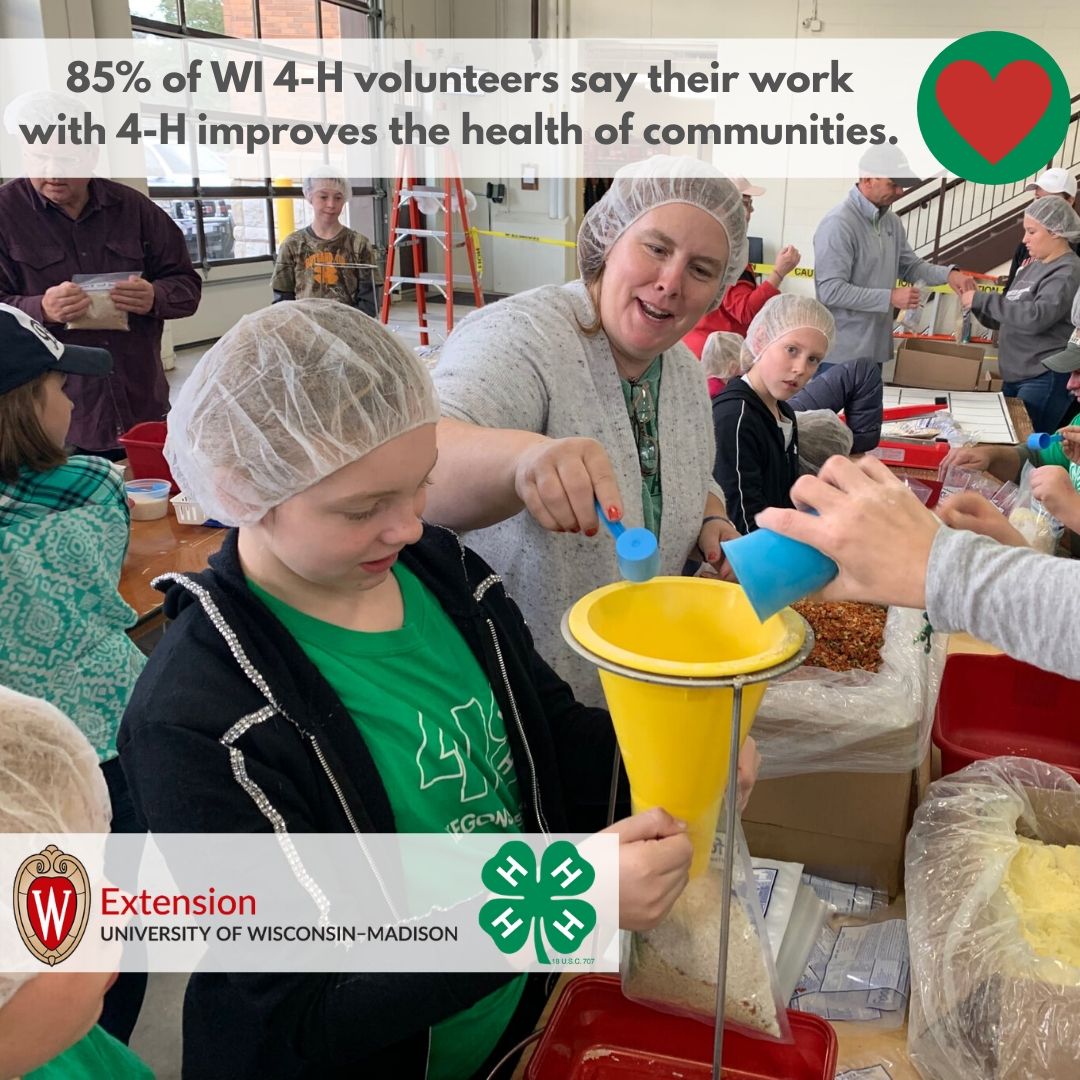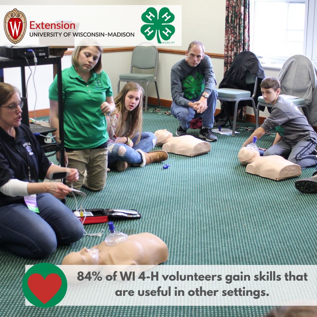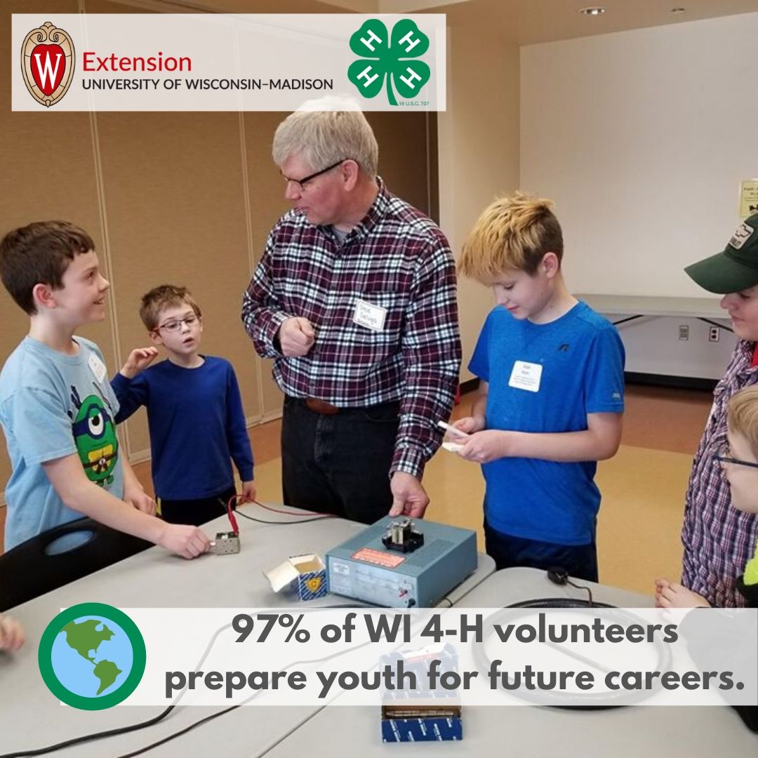 Wisconsin 4-H volunteers are youth and adults working together to make a difference in the lives of young people. Volunteers work with Extension Youth Development professionals to develop the life skills of youth members, thus benefiting the state, employers, and the economy. Volunteers not only have the satisfaction of contributing to the future of young people, they also learn new skills that may advance their careers.